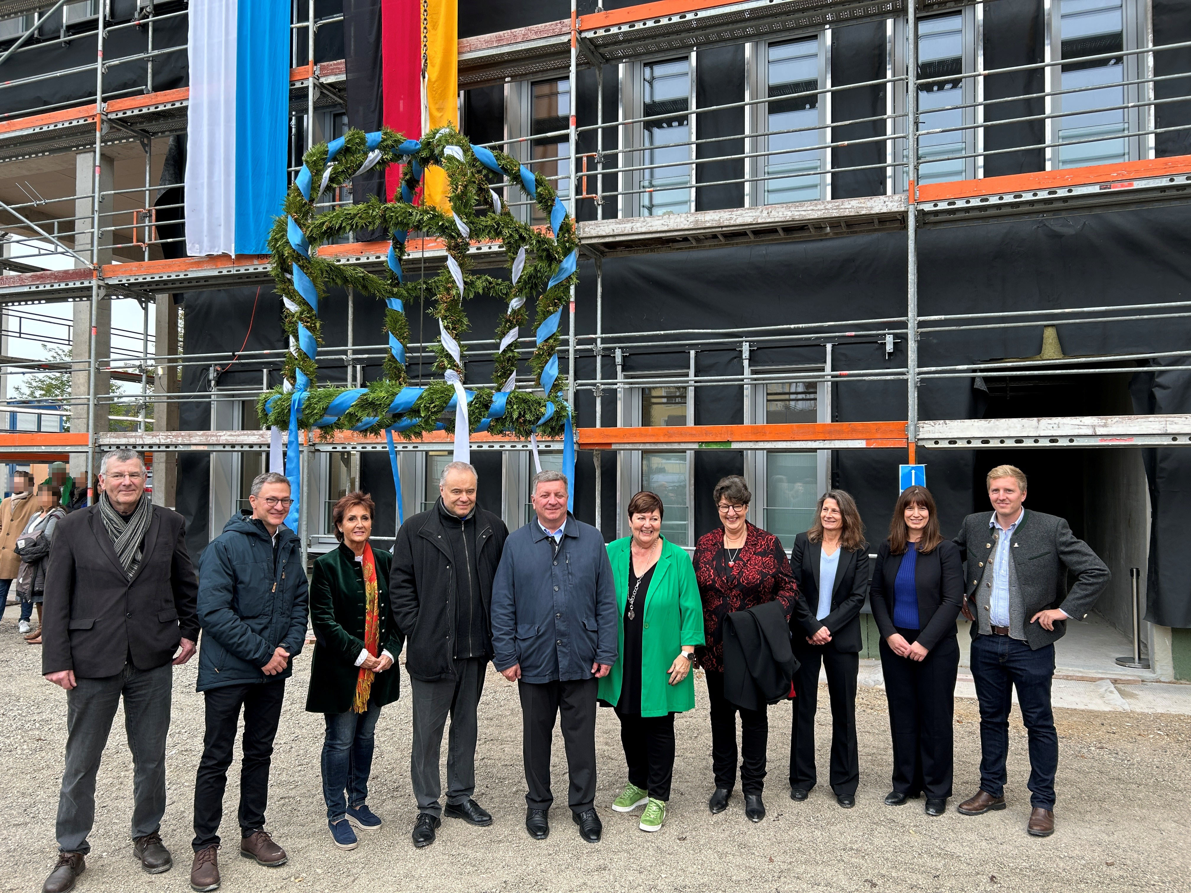Zum feierlichen Richtfest am Donnerstag, den 9. Oktober 2025 freuen sich Behördenleiter Stefan Scheckinger (Leitender Baudirektor und Bereichsleiter Straßenbau), seine stellvertretende Behördenleiterin und Bereichsleiterin Hochbau, Baudirektorin Christina von Scheurl, zusammen mit dem Projektteam und den teilnehmenden Mitarbeitern Vertreter der bayerischen Staatsbauverwaltung, aus der Politik und eine Delegation des Totalunternehmers begrüßen zu können. Darunter Staatsminister Christian Bernreiter (Bayerisches Staatsministerium für Wohnen, Bau und Verkehr), Harald Kühn (MdL), Andrea Jochner-Weiß (Landrätin des Landkreises Weilheim-Schongau) und Angelika Flock, zweite Bürgermeisterin der Stadt Weilheim.